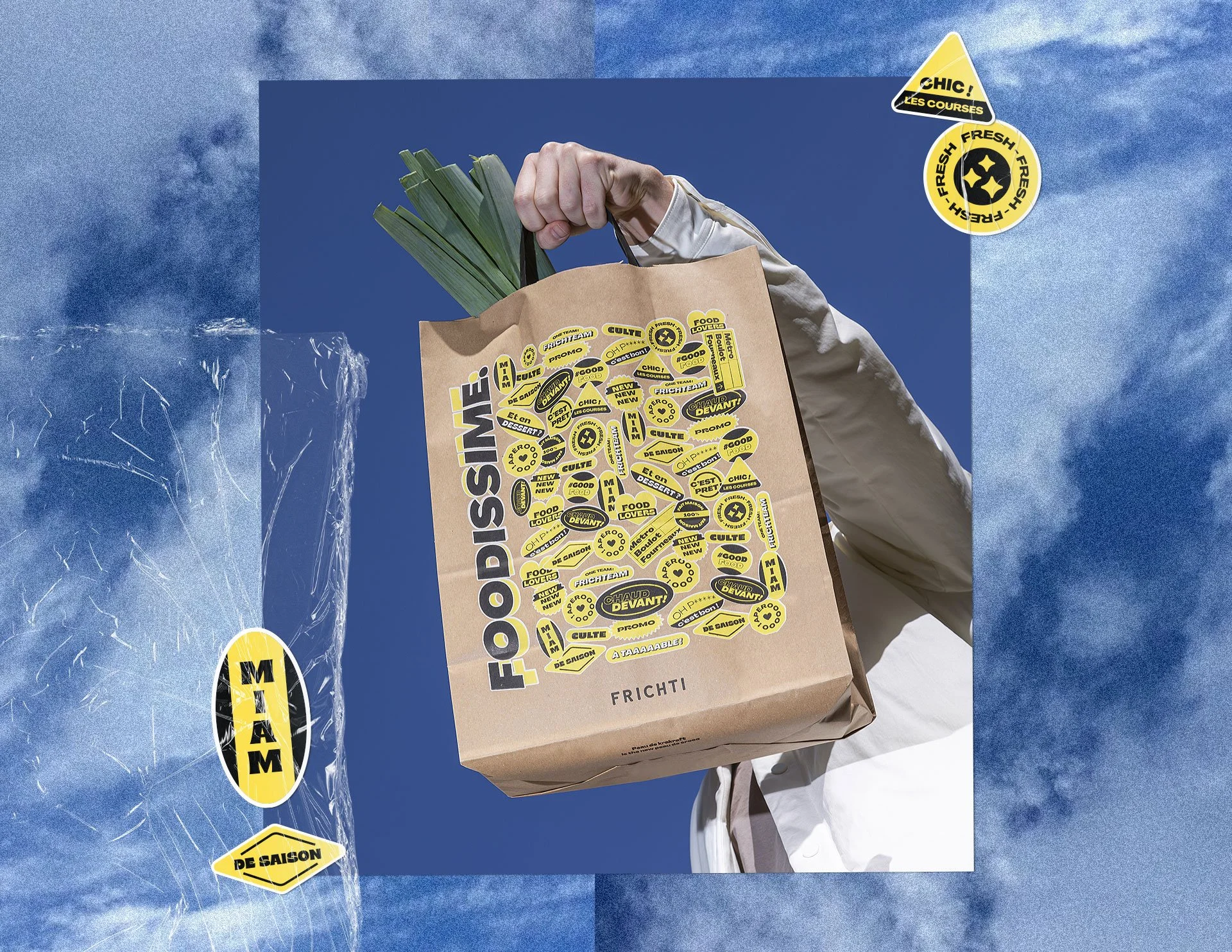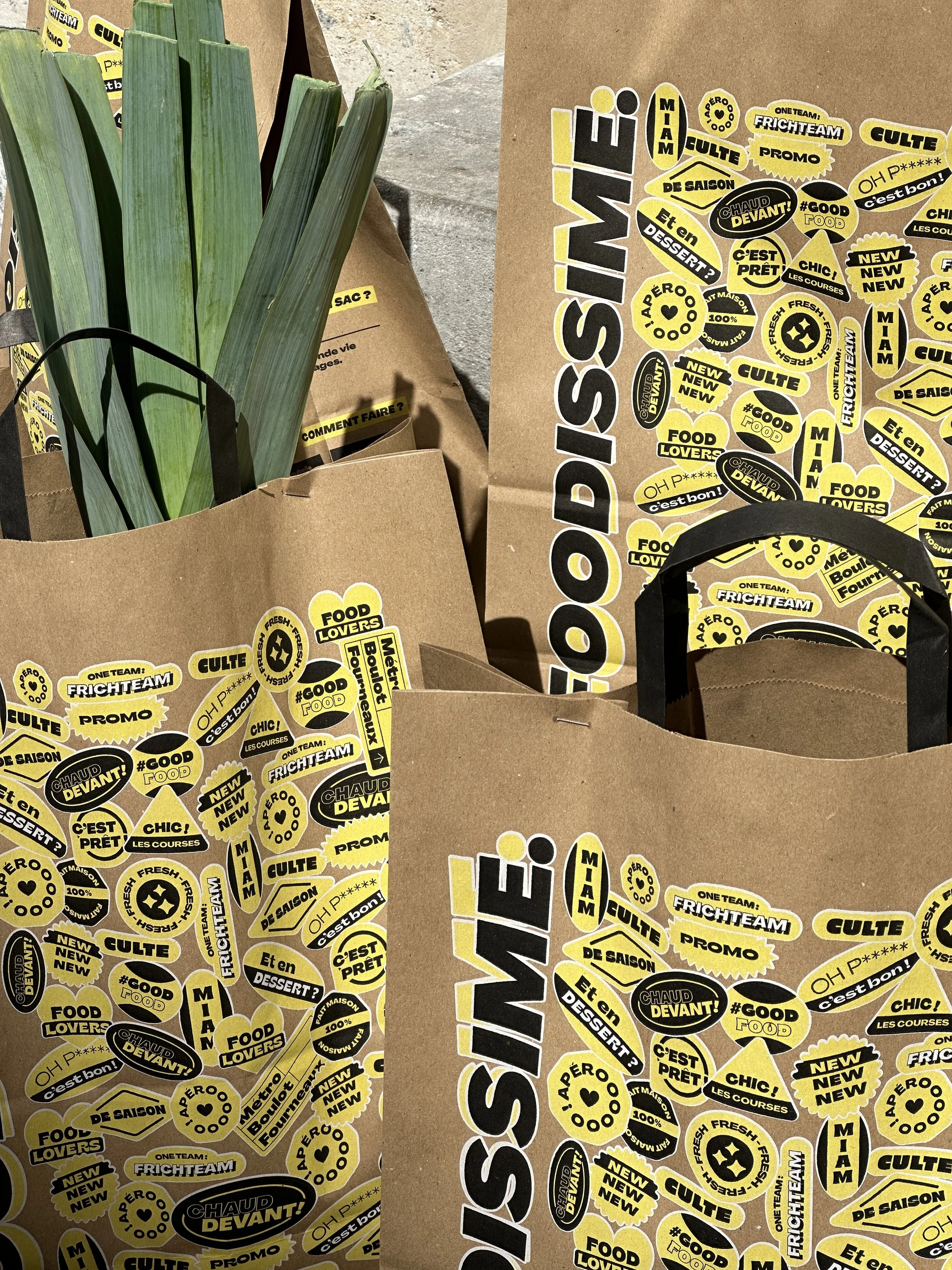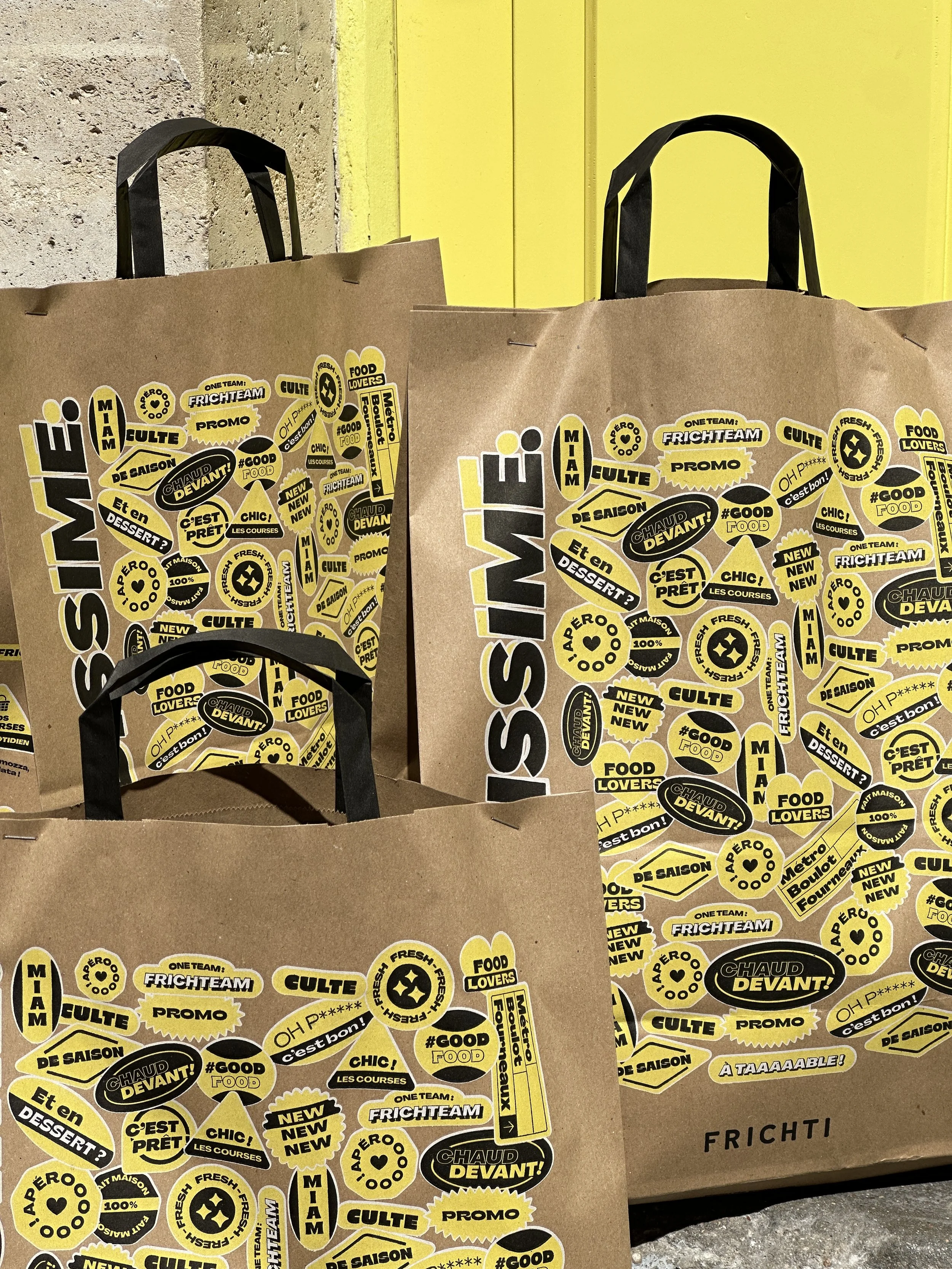 L’un des supports phares d’une marque disponible en livraison c’est le sac. Chez Frichti, le sac est le même depuis 3 ans et il dit “AIMEZ. BIEN. MANGER.“ : un statement qui correspond sûrement à une ambition de marque de l’époque qui n’est plus d’actu. C’est pour cette raison que nous avons ouvert un chantier aussi big qu’enthousiasmant, celui d’écrire notre nouvelle vision de marque sur nos sacs.