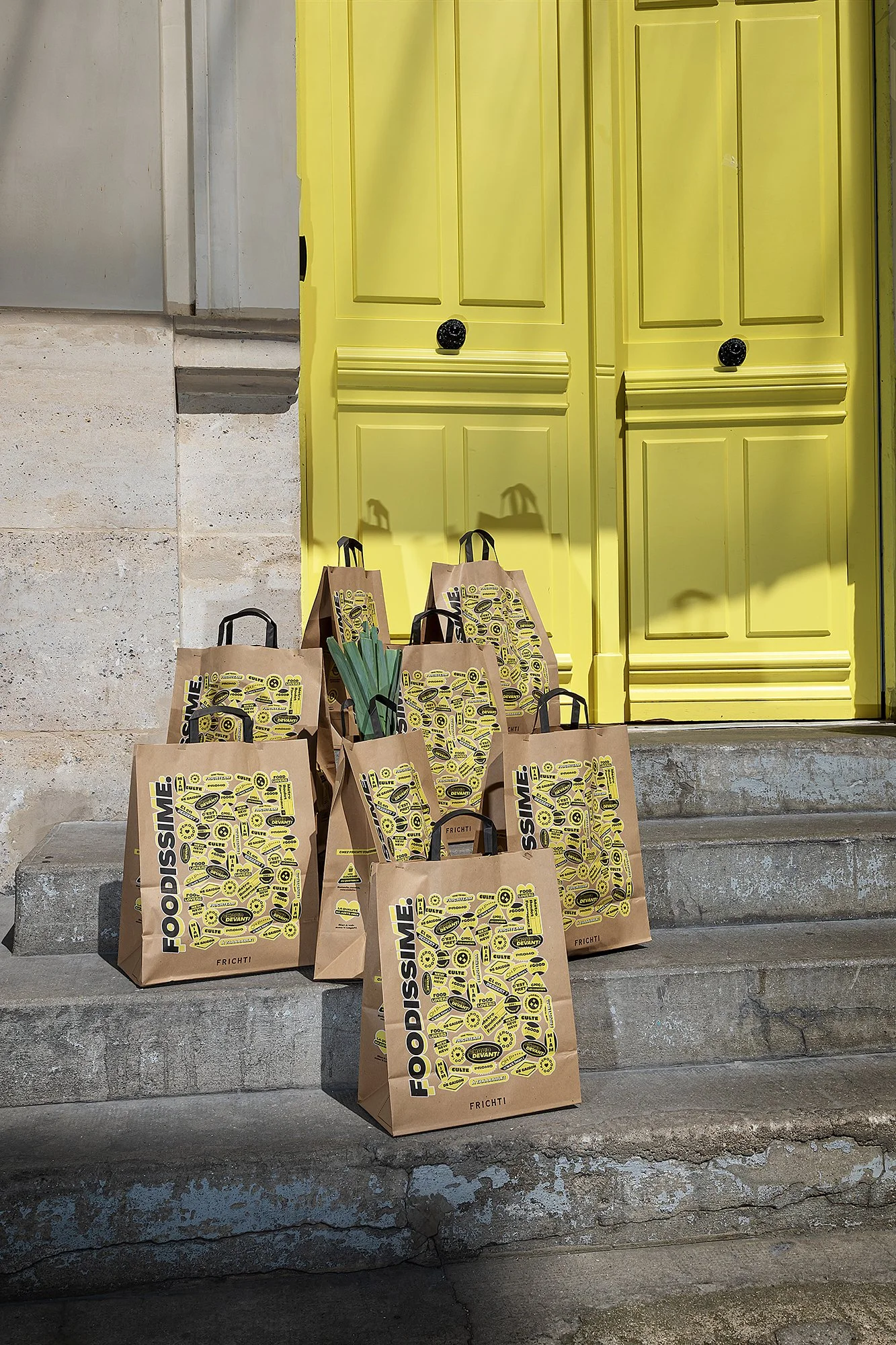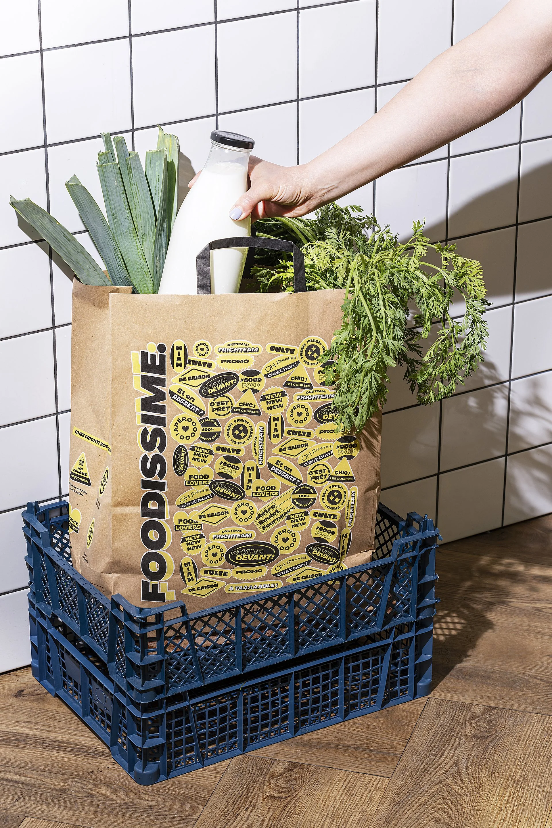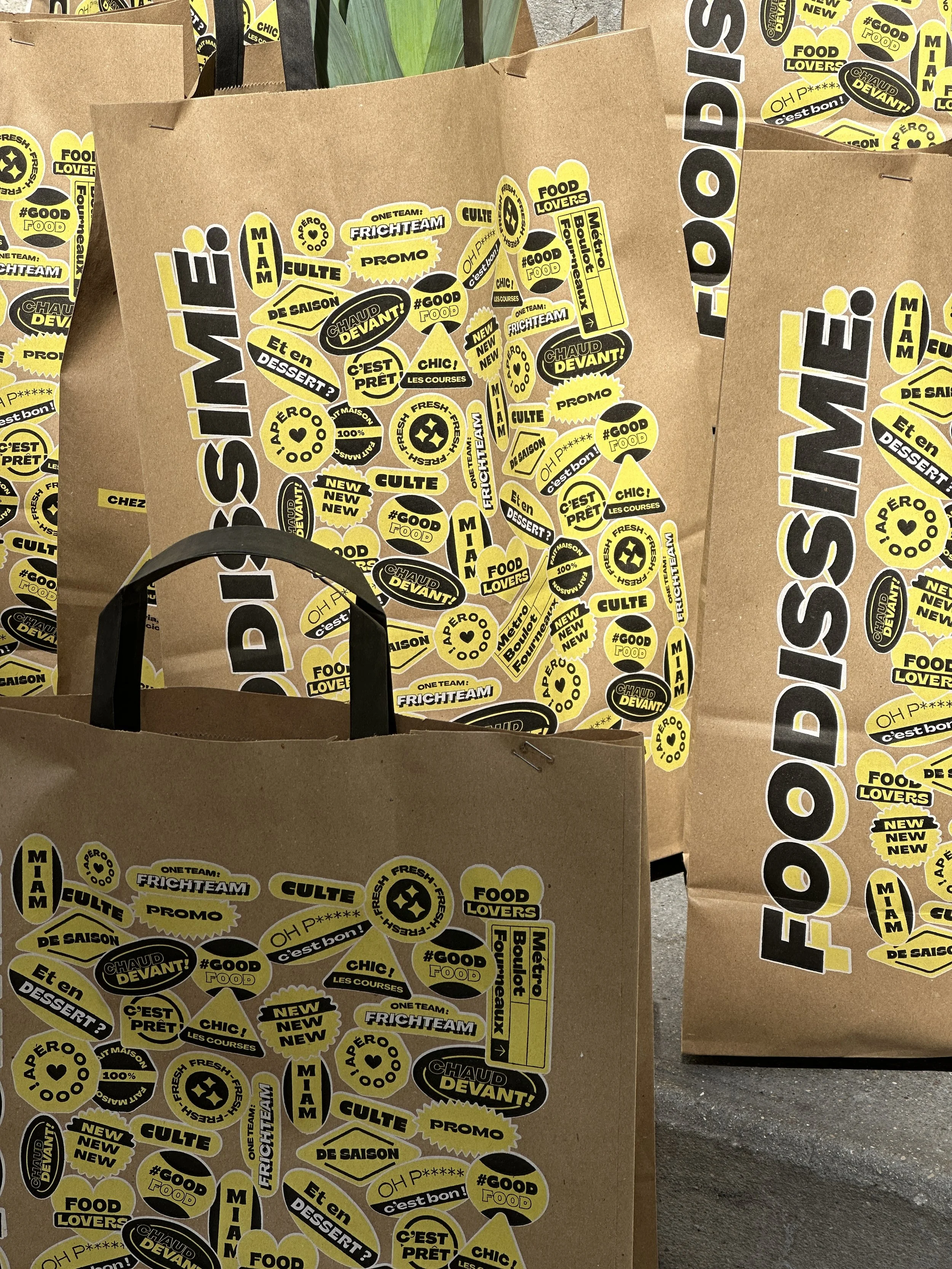L’un des supports phares d’une marque disponible en livraison c’est le sac. Chez Frichti, le sac est le même depuis 3 ans et il dit “AIMEZ. BIEN. MANGER.“ : un statement qui correspond sûrement à une ambition de marque de l’époque qui n’est plus d’actu. C’est pour cette raison que nous avons ouvert un chantier aussi big qu’enthousiasmant, celui d’écrire notre nouvelle vision de marque sur nos sacs.