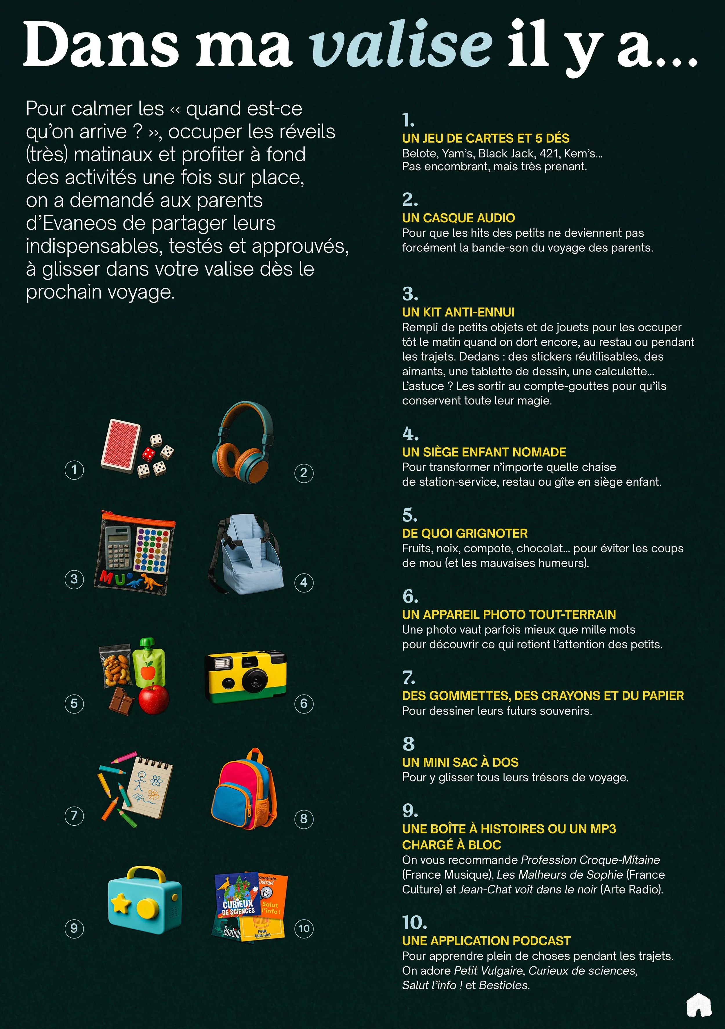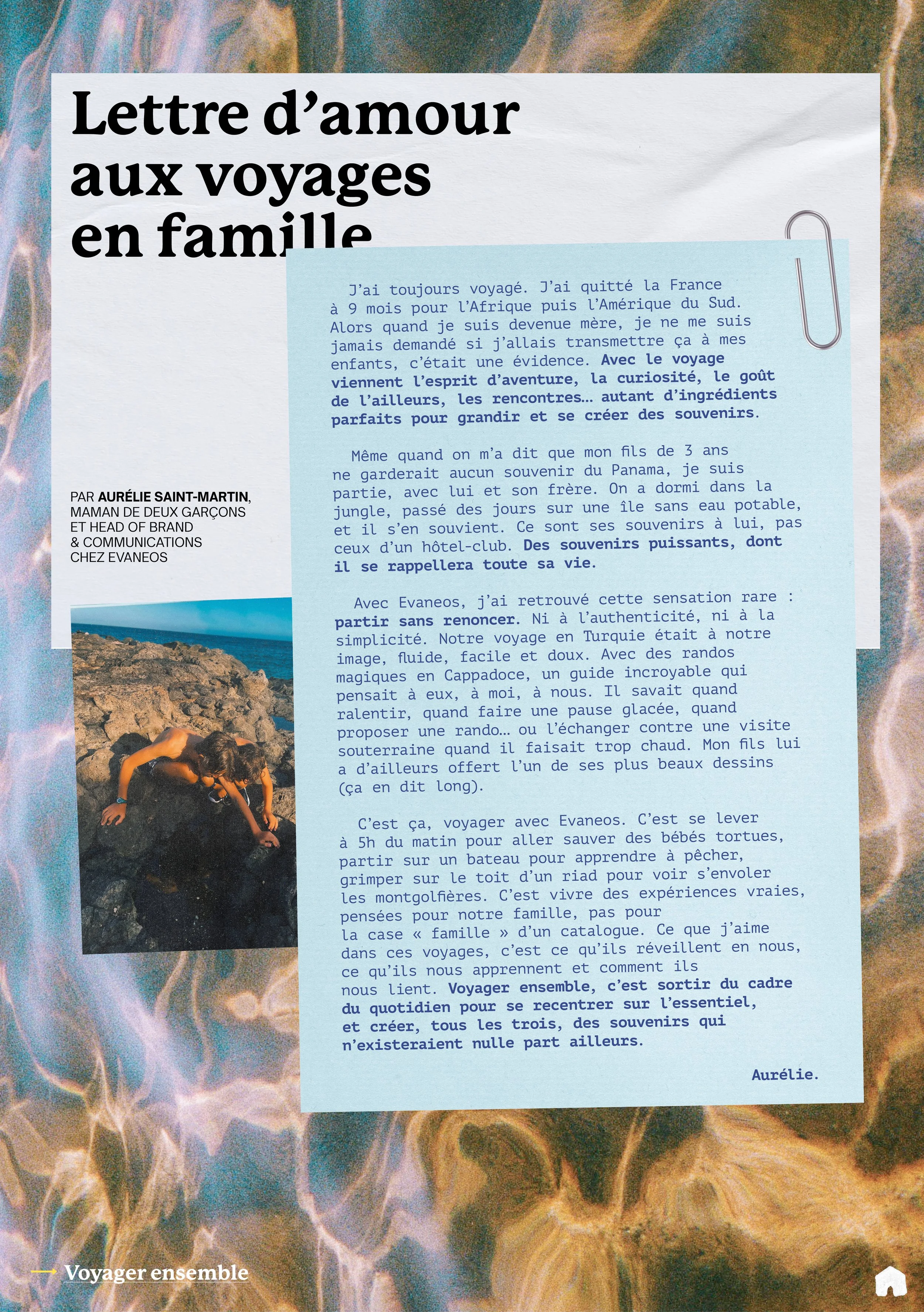 Pour accompagner Evaneos dans le développement de son offre Famille, un minibook digital a été imaginé comme un support à la fois inspirant et rassurant. L’objectif : offrir aux parents un format chaleureux qui donne envie de voyager tout en répondant aux questions essentielles liées aux voyages avec enfants. Entre tonalité éditoriale immersive et informations pratiques, le document devait aider chaque famille à se projeter dans une aventure sur-mesure.